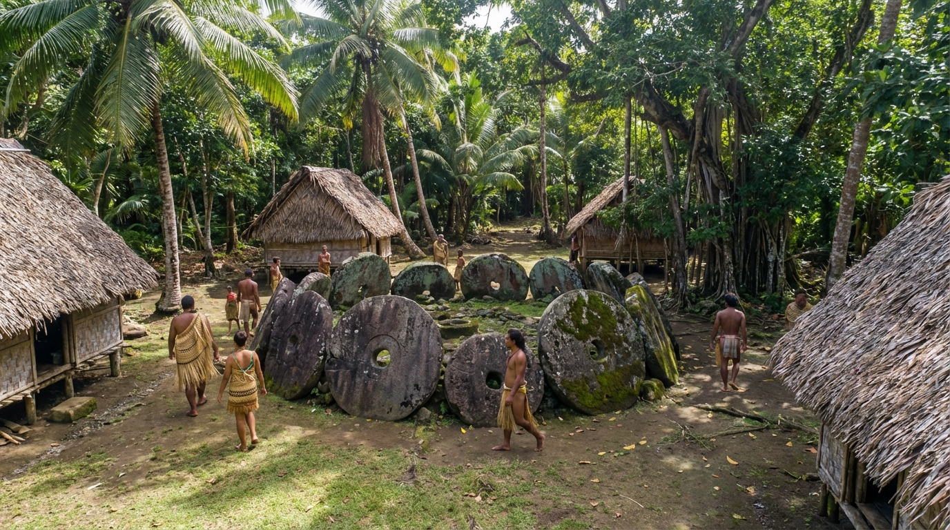 L’extraction des blocs, originellement taillés à Palau, impliquait une expédition risquée. Les rameurs voguaient plusieurs jours sans boussole, guidés par la course des étoiles. Une fois la pierre débarquée, le clan client devait tenir un « sacrifice de taro » pour remercier la mer et les esprits. Jusqu’à l’arrivée de quelques explorateurs européens, le calcaire restait rare ; son spectre blanc dans la jungle donnait une aura de surnaturel. Même aujourd’hui, offrir un disque pendant un mariage signe l’inclusion d’une nouvelle famille dans le réseau des obligations réciproques.